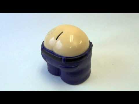 by sliding off the top of the bank. This Farting Butt Bank is a real stinker!