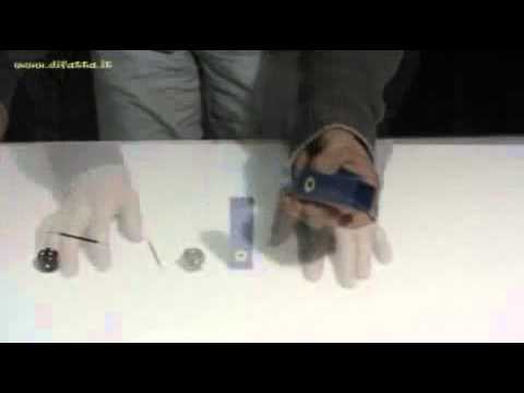 The Magician shows a die and a small tube. They both have a hole which goes through them from side to side. A spectator puts the die inside the tube, lining up the holes; then he passes a bar through the holes of the tube, blocking the die inside. Now, with a magic gesture, the performer makes the die penetrate the bar and come out of the tube, dropping on the table!• It can be immediately repeated.
