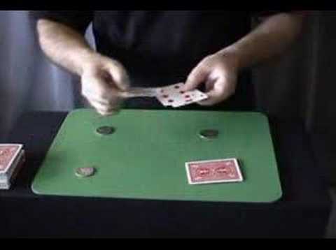 From a shuffled deck, four cards are removed and tabled. With no false moves, the cards are slid aside and four coins have appeared underneath the cards! The coins and cards are then used in a Matrix routine, which is explained. A truly diabolical gimmick that can produce quarters does all the work for you. This excellent utility accessory will make you look like a real sleight of hand expert. Each gimmick is hand made on Bicycle card stock. Available in red or blue. Includes gimmick and instructions only. Coins and a regular matching Bicycle deck are not included.