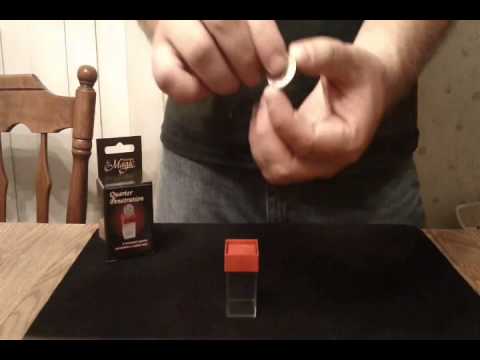 Magician places a coin on the lid of the box. Covering the coin with a playing card, the Magician taps the lid of the box. The coin penetrates the box top! Removing the card from the lid shows the spectators that there were no duplicate coins involved.