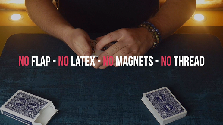 Imagine a freely selected card placed in between a pair of cards. The 3 cards are shown front and back and the middle card changes color (from blue to red).