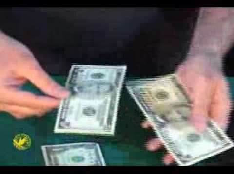 Four $1 bills are shown front and back. One of the dollar bills is replaced with a $5 bill. Suddenly all the bills change to $5 bills! Now, one of the five dollar bills is exchanged for a $10 bill, a moment later all the bills are now $10 bills! The amazed spectators are immediately told that what they've just seen is not only impossible, but probably illegal. With that in mind, the Magician changes the bills back to $1 bills that are once again shown on both sides.
