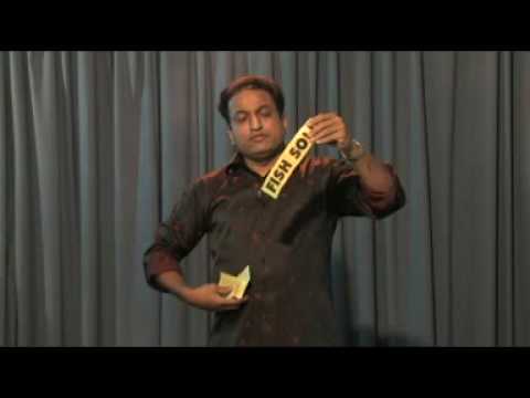 A strip of paper has "FRESH FISH SOLD HERE" printed on it (black lettering on yellow paper). To a story, the Magician tears off one word at a time from the strip until only one word remains. Then suddenly, he/she opens out the pieces which have magically restored themselves into the entire strip once again!